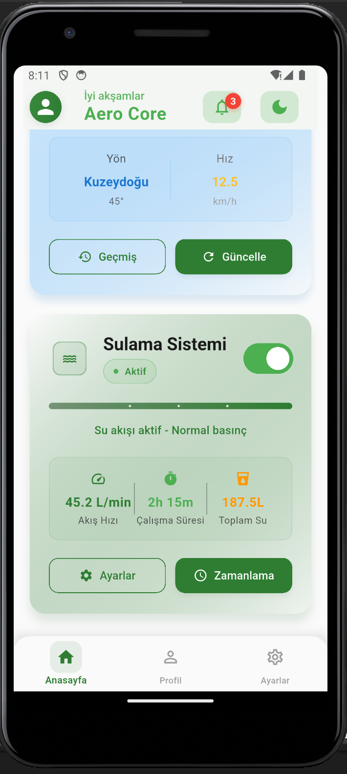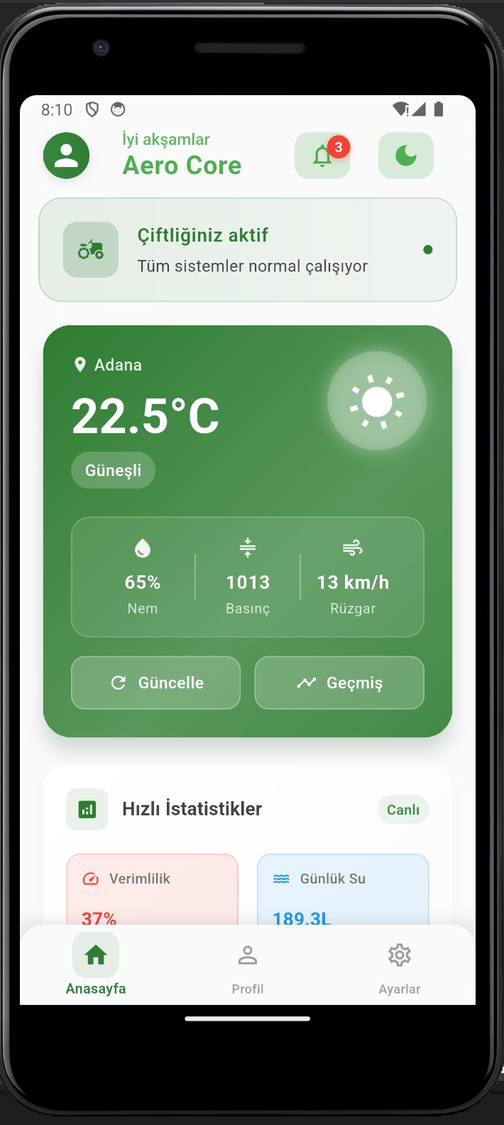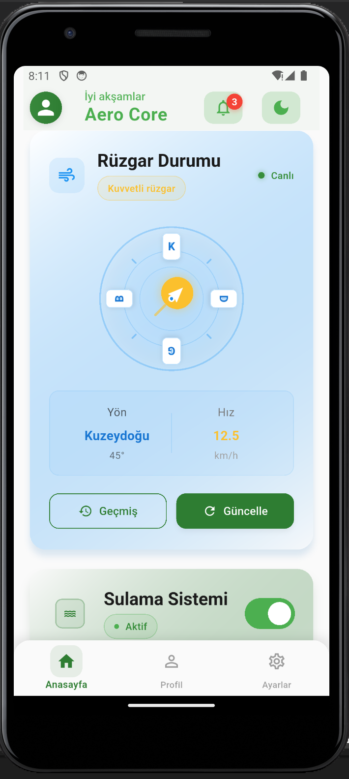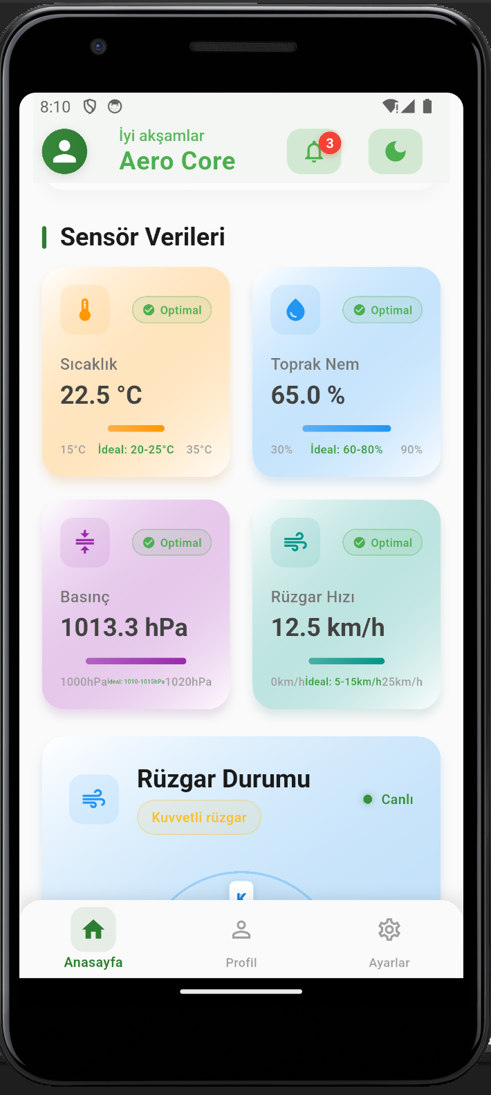 AeroCore, akıllı tarımı sahada uygulanabilir hale getiren donanım ve yazılım bileşenlerinden oluşur.Sistemimiz, tarım arazilerindeki çevresel verileri anlık olarak toplayan çeşitli sensör modülleriyle donatılmıştır: